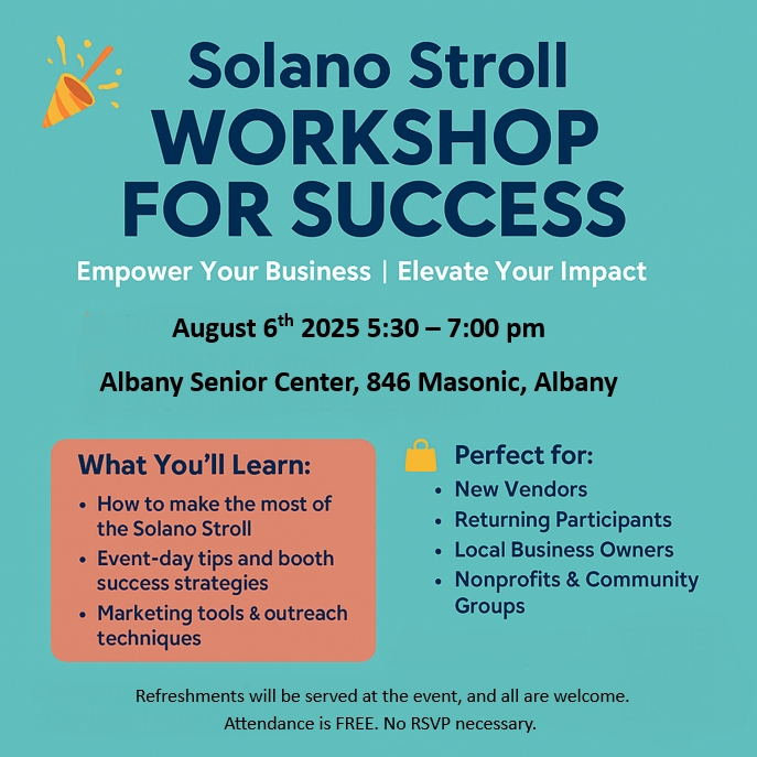 Are you prepared to take advantage of this annual Solano Avenue showcase? Listen to the success stories of business owners who, year after year, have utilized the Stroll to build their customer base and reputation. Join the Albany Chamber of Commerce and the Solano Avenue Association, at the Albany Senior Center, to learn how we can help you engage with future customers. Refreshments will be served at the event, and all are welcome.